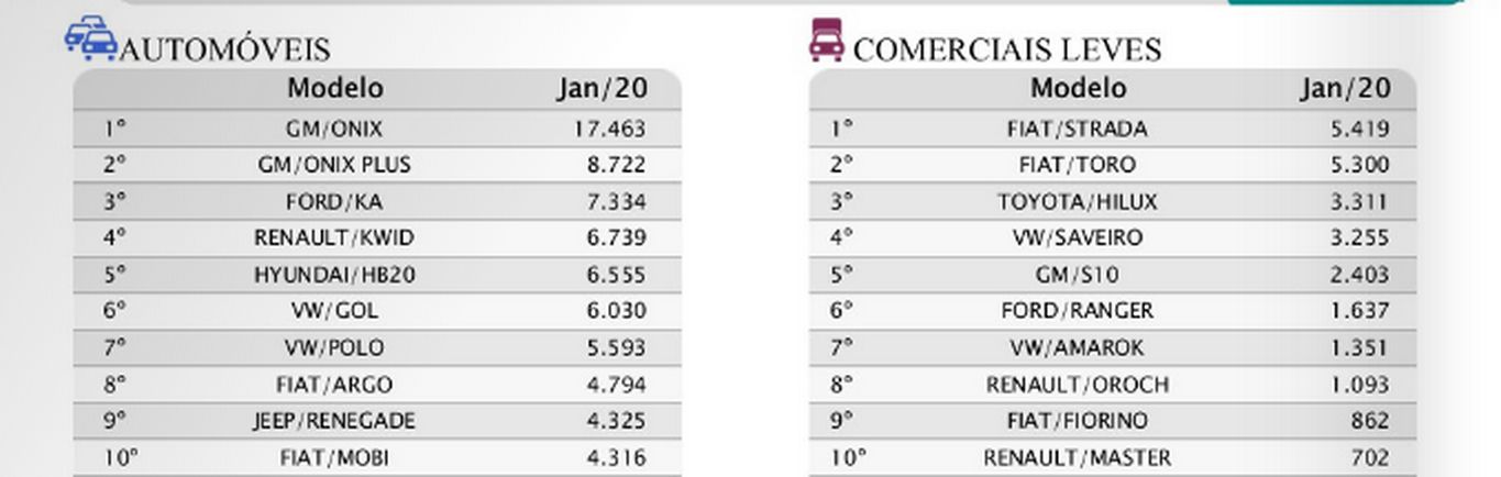 O ano de 2020 começou como terminou 2019, com a dupla da Chevrolet Onix e Onix Plus no topo dos mais vendidos. Apesar da manutenção das posições com relação a dezembro, ambos perderam vendas. O hatch caiu 18,56%, enquanto o sedã teve as vendas reduzidas em 12,68%. Juntos, foram emplacados em pouco mais de 26 mil oportunidades.