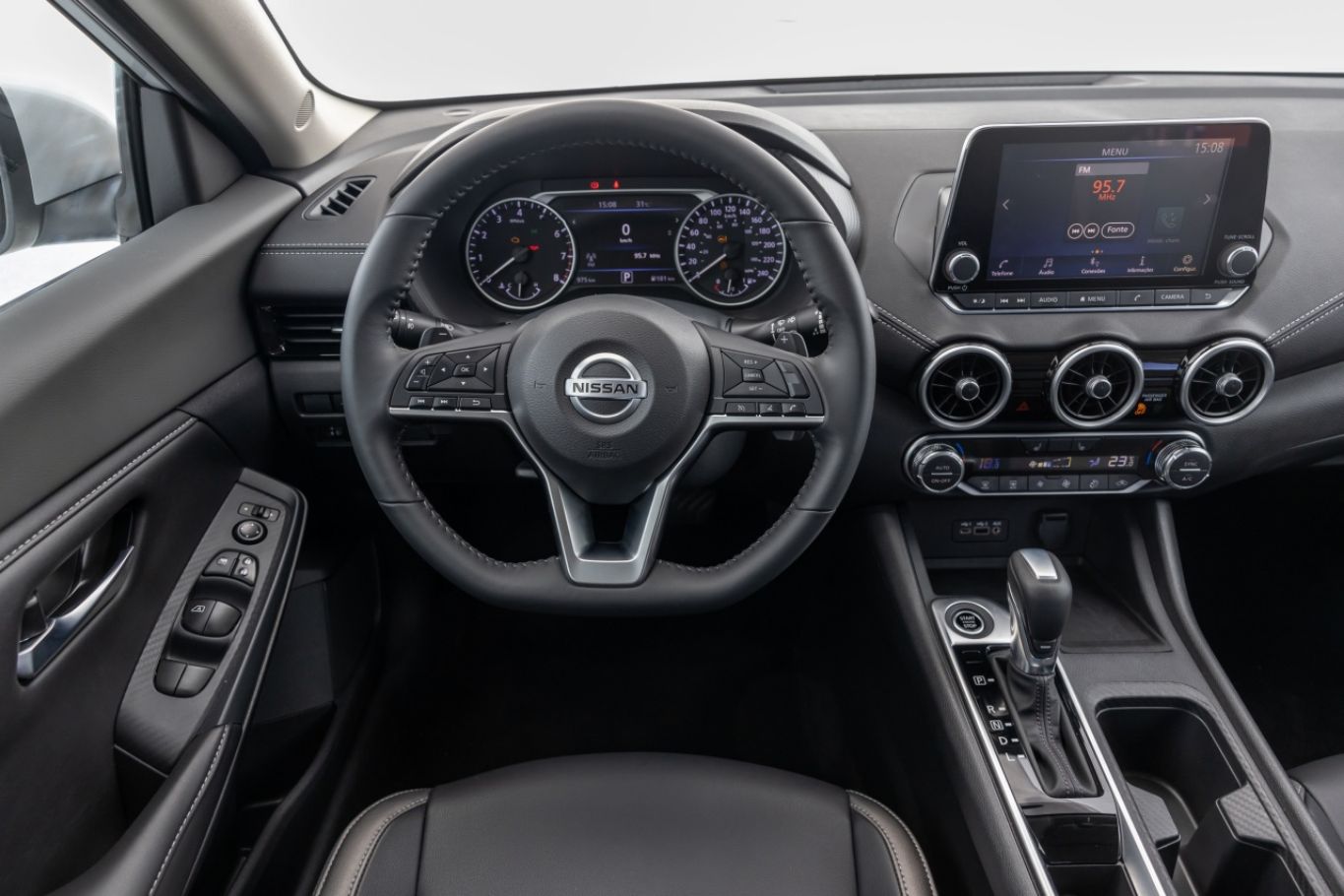 O interior do novo Sentra em quase nada remete ao modelo anterior. Os materiais – macios ao toque no painel e nas portas dianteiras – são de melhor qualidade, apesar de o volante ser o mesmo de Kicks, Versa e Frontier. Na versão Exclusive, a cabine pode receber acabamento bicolor por R$ 1.700 extras (é o único opcional do sedã).