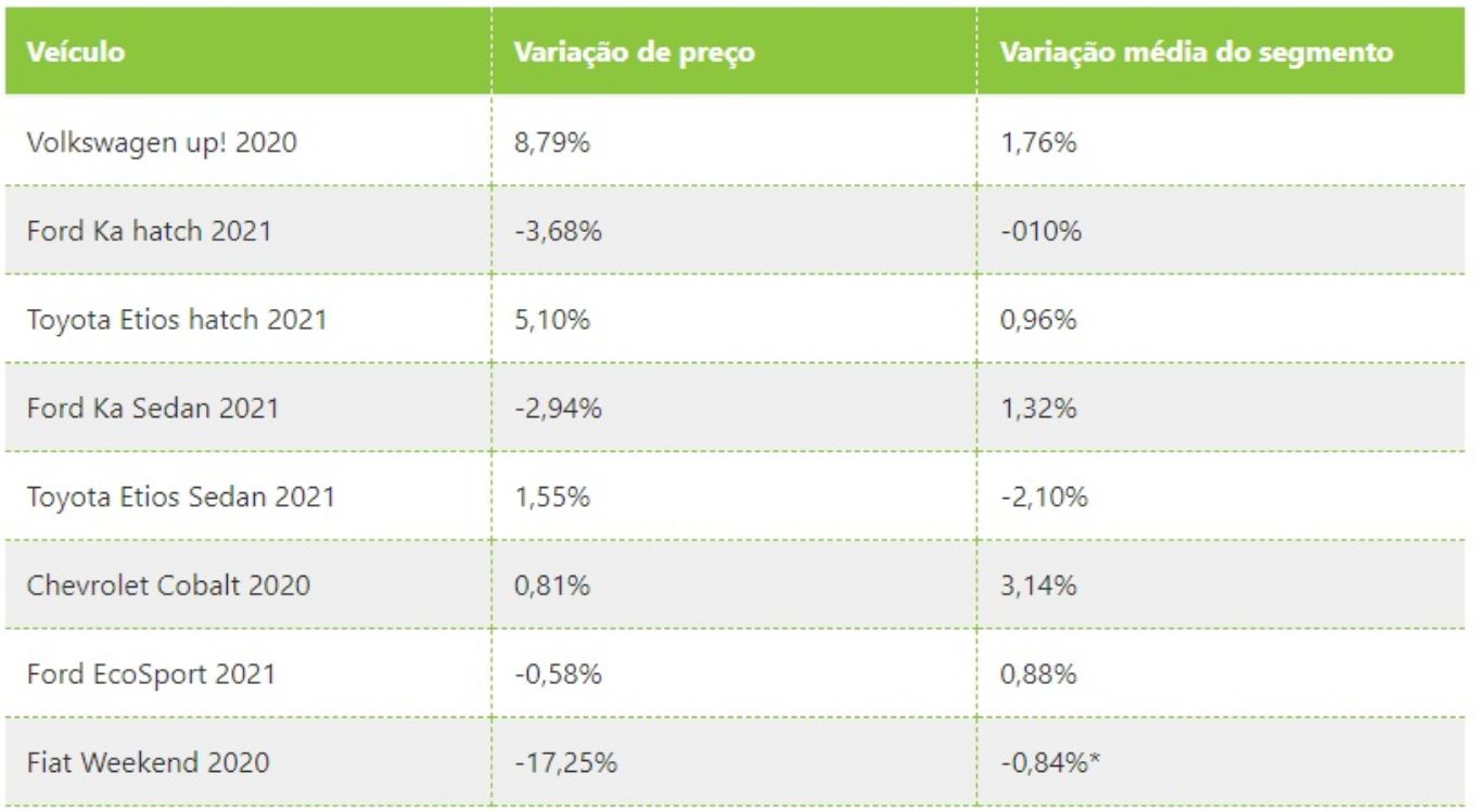 Os números revelam que não há um padrão para um carro que saiu de linha, ao menos entre os modelos pesquisados: há tanto veículos cujos preços variaram abaixo quanto acima da média dos respectivos segmentos; metade deles até apresentou valorização. Confira: