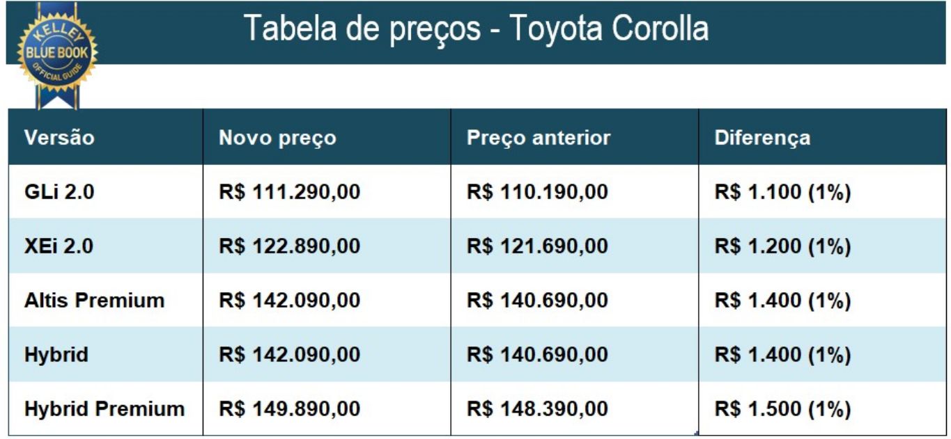 Confira a nova tabela de preços do Corolla: