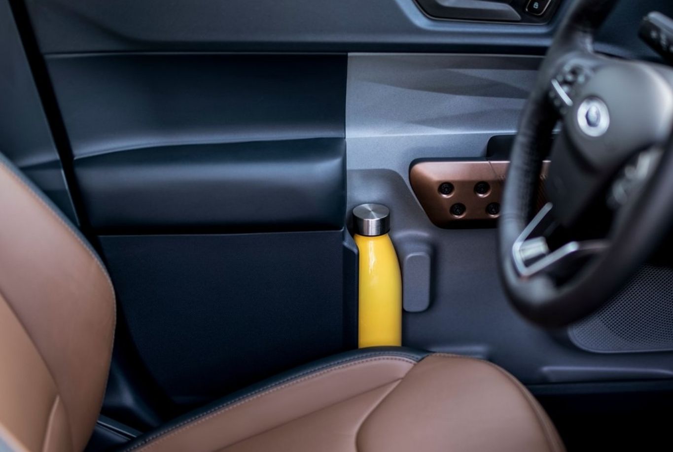 O acabamento, apesar de simples, utiliza plásticos de boa qualidade com diferentes texturas e formas. O puxador das portas, por exemplo, é cortado para que seja possível guardar uma garrafa no porta-objetos. O console central é amplo e possui três grandes nichos para guardar objetos.